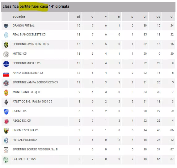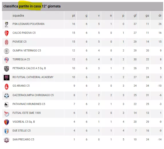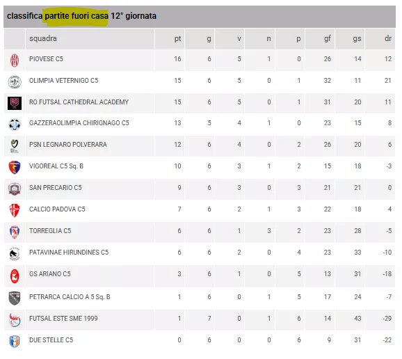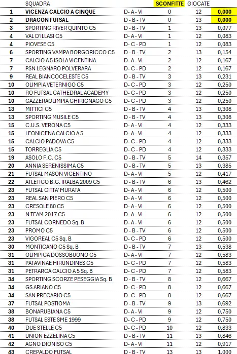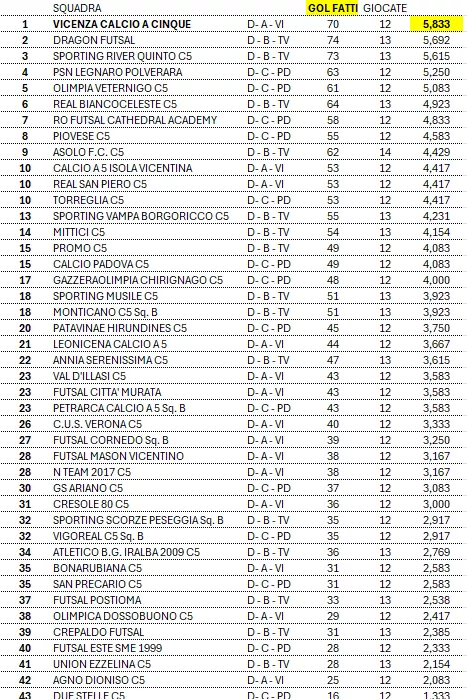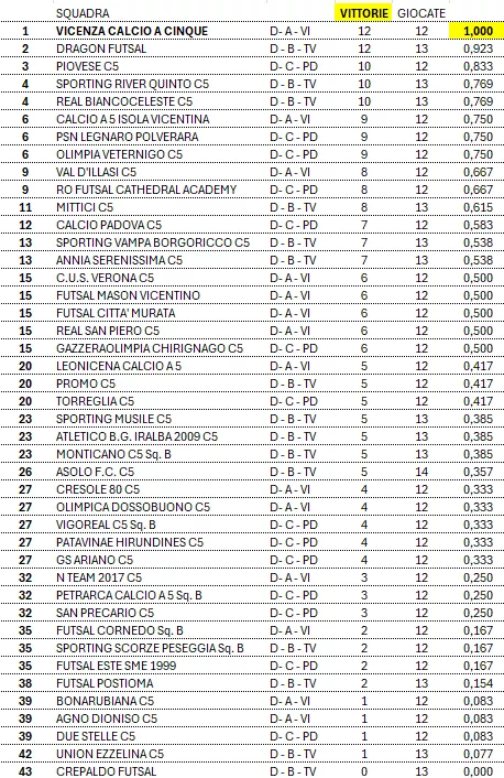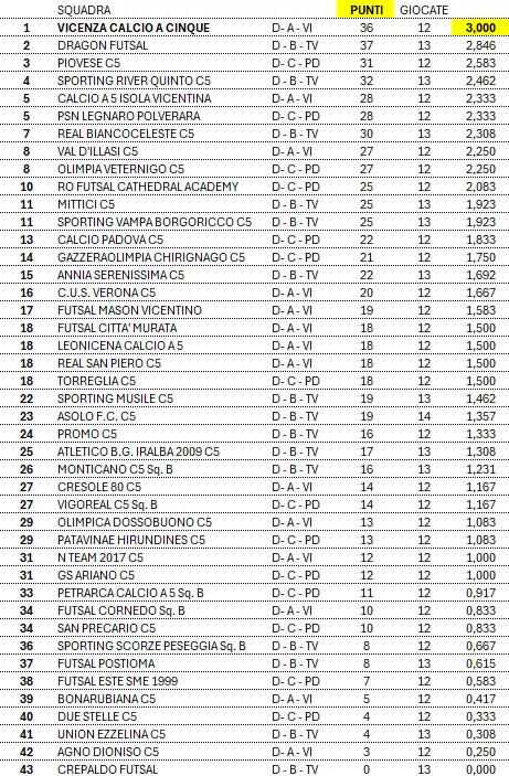 Al comando della classifica regionale per punti troviamo il DRAGON FUTSAL (Mister Dumbrava Vladimir), capace di raccogliere ben 37 punti. Tuttavia, il primato per la media punti perfetta spetta al VICENZA CALCIO A CINQUE (Mister Cavallo Vincenzo), che vanta 36 punti ottenuti con 12 vittorie su altrettante gare giocate, mantenendo un impressionante 3,000 di media. Nel Girone C, la PIOVESE C5 (Mister Michelin Riccardo) si conferma regina del padovano con 31 punti e 10 vittorie.