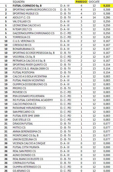 È il raggruppamento più spettacolare in termini realizzativi. Oltre alla capolista di Mister Dumbrava Vladimir, brillano lo SPORTING RIVER QUINTO C5 e il REAL BIANCOCELESTE C5 (Mister Candiotto Massimo). Menzione speciale per gli specialisti della X: lo SPORTING VAMPA BORGORICCO C5 (Mister Ceccarello Francesco), lo SPORTING MUSILE C5 (Mister Zorzetto Ferdinando) e l'ASOLO F.C. C5 (Mister Rilind Kryeziu), tutti con 4 pareggi.