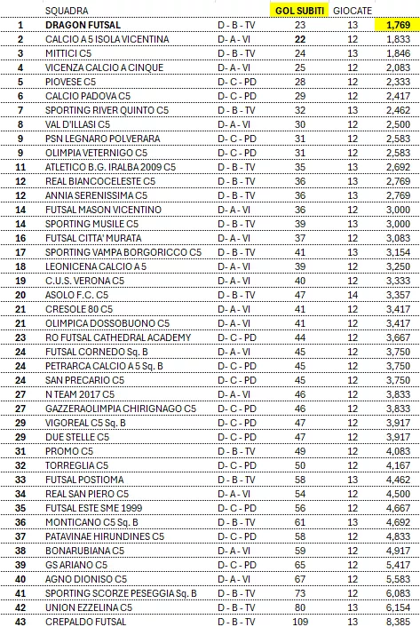 La palma di squadra più difficile da battere è condivisa tra VICENZA CALCIO A CINQUE e DRAGON FUTSAL, entrambe ancora con lo 0 nella casella delle sconfitte. Analizzando la fase difensiva, il C5 ISOLA VICENTINA C5 (Mister Pandini Stefano) detiene la miglior difesa assoluta con soli 22 gol subiti, tallonato dal DRAGON FUTSAL con 23 e dai MITTICI C5 (Mister Tela Lindim) con 24 reti al passivo.