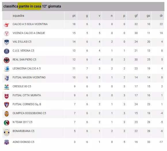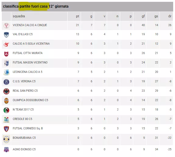 Il VICENZA CALCIO A CINQUE di Mister Cavallo Vincenzo sta disputando un campionato a parte, ma alle sue spalle la lotta è accesa. Da sottolineare la tenuta difensiva del CALCIO A 5 ISOLA VICENTINA C5 (Mister Pandini Stefano) a punti 28 e la crescita del VAL D'ILLASI C5 (Mister Raso Vincenzo), attualmente tra le prime della classe con 27 punti, mentre il FUTSAL CORNEDO Sq. B (Mister Urbani Alberto) si distingue per il record di pareggi (4).