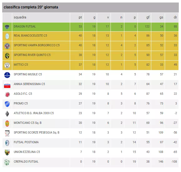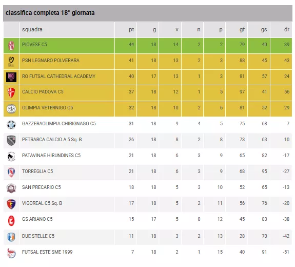 La classifica a otto turni dalla fine vede la PIOVESE C5 (44 pt) al comando, ma con il fiato sul collo del PSN LEGNARO POLVERARA (41 pt) e di una RO FUTSAL CATHEDRAL ACADEMY (40 pt) che ha ancora una gara da recuperare contro il Gs Ariano. Il CALCIO PADOVA C5 (37 pt), nonostante il miglior attacco, scivola al quarto posto, mentre l'OLIMPIA VETERNIGO C5 (32 pt) chiude attualmente la zona Play Off, tallonata dal GAZZERAOLIMPIA CHIRIGNAGO C5 (31 pt).