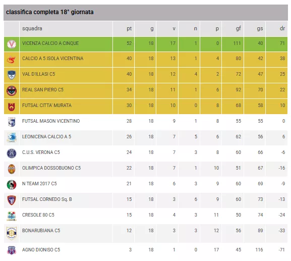 Il verdetto della 18ª giornata rafforza la dittatura del VICENZA CALCIO A CINQUE, ormai lanciato verso la Serie C2 con 52 punti. La vera bagarre è per i Play Off: CALCIO A 5 ISOLA VICENTINA e VAL D'ILLASI C5 (entrambi a 40 punti) sembrano avere una marcia in più per blindare il secondo e terzo posto. Attenzione al REAL SAN PIERO C5 (34 pt), che deve guardarsi le spalle dal ritorno prepotente del FUTSAL CITTA' MURATA (30 pt), ora ufficialmente in quinta posizione e dunque nell'ultimo slot disponibile per la post-season.