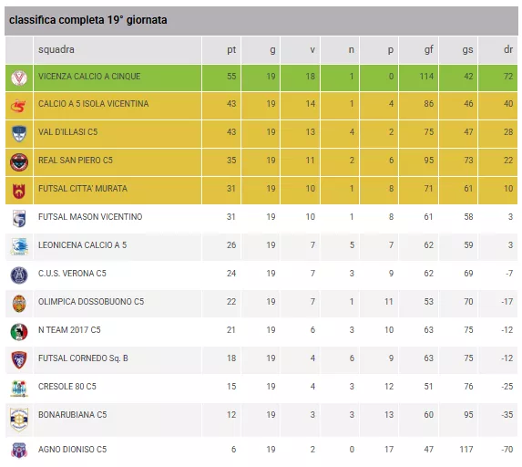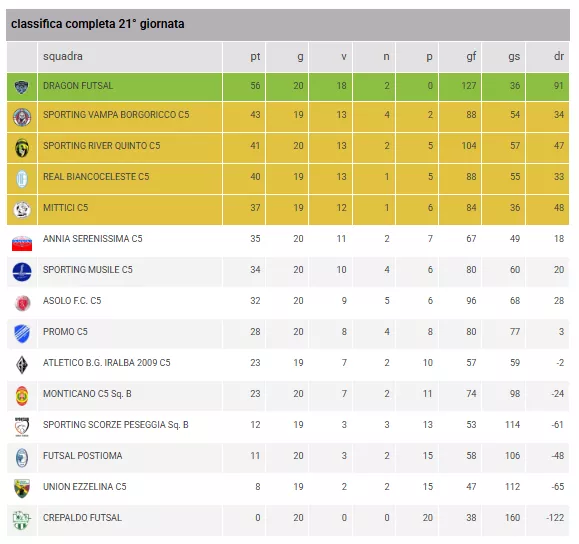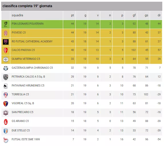 Con 11 giornate ancora da giocare, la classifica è cortissima nelle prime quattro posizioni: PSN LEGNARO POLVERARA e PIOVESE C5 guidano a 44 punti, tallonate dal RO FUTSAL CATHEDRAL ACADEMY a 43 e dal CALCIO PADOVA C5 a 40.