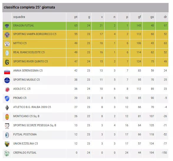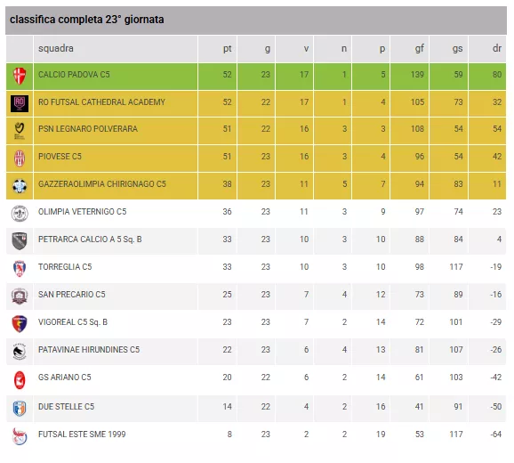 La Trappola della "Forbice" Play-off: La lotta per il post-season è infuocata. Se le prime quattro (Padova, Cathedral, PLN e Piovese) sembrano avere un passo superiore, il GAZZERAOLIMPIA CHIRIGNAGO C5 (38 punti) deve guardarsi le spalle dall'Olimpia Veternigo (36 punti). Attenzione però al regolamento: il distacco attuale tra la seconda (52 punti) e la quinta (38 punti) è di ben 14 punti. Se questo gap non scenderà sotto la soglia dei 7 punti, i Play-off regionali tra queste due posizioni non verranno disputati, regalando il passaggio diretto alla seconda classificata.