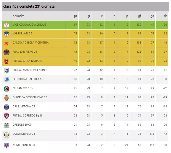 Play-Off: Certezze e Speranze: Il VAL D'ILLASI C5 (53 punti) e il CALCIO A 5 ISOLA VICENTINA (52 punti) sono già certi di partecipare alla post-season. L'attuale distacco del Val d'Illasi (2ª) sul Città Murata (5ª) è di 13 punti ed dall'Isola (3ª) di 12 punti, il che esclude quasi matematicamente i padovani dai giochi a causa del gap dei 7 punti dalla seconda.