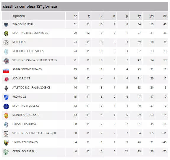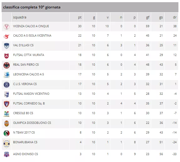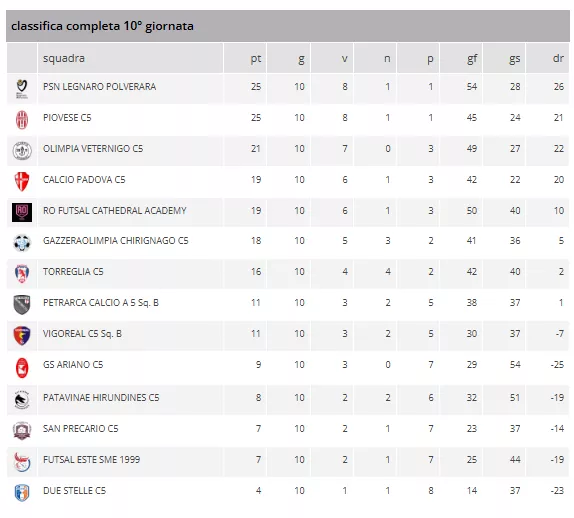 Il PSN LEGNARO POLVERARA e la PIOVESE C5 mantengono la testa della classifica a quota 25 punti, seguiti dall'OLIMPIA VETERNIGO C5 (21 punti) e dal CALCIO PADOVA C5 (19 punti). Da notare che il RO FUTSAL CATHEDRAL ACADEMY (19 punti) si conferma la squadra con il maggior numero di reti segnate (50) nel girone. La squadra con la migliore difesa (22 reti subite) è il CALCIO PADOVA C5.