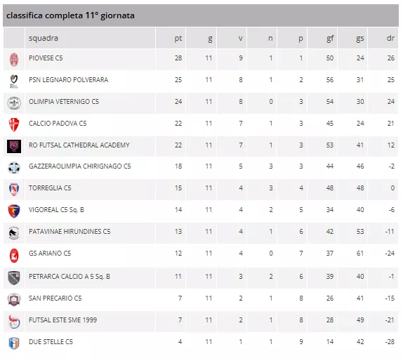 La PIOVESE C5 si conferma leader indiscusso del girone, forte di 28 punti e della co-miglior difesa del campionato, avendo subito solo 24 reti (dato condiviso con CALCIO PADOVA C5). La capolista espugna il campo del fanalino di coda DUE STELLE C5 con un convincente 0 a 5 (Primo Tempo: 0 a 3). I ragazzi di Mister Michelin Riccardo hanno messo in cassaforte i tre punti grazie alla doppietta di Sarto Leonardo e ai gol di Zanazzi Mattia, Toffanin Nicolò e Azzolin Mattia. A difendere la porta della capolista c'era la "saracinesca" Calgaro Daniele.