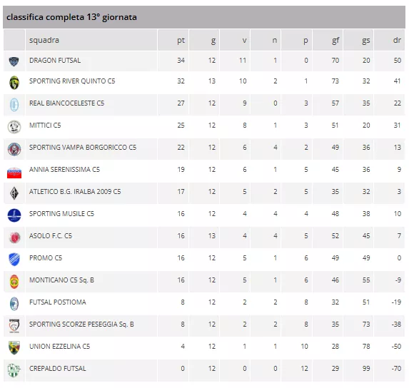 Venerdì 12 e Sabato 13 dicembre si è disputata la Tredicesima Giornata del Girone B del Campionato Regionale di Serie D Gir B TREVISO 2025/2026 che continua a regalare emozioni. DRAGON FUTSAL continua la marcia a suon di gol, con lo SPORTING RIVER QUINTO che cerca di star in scia e intanto mantiene a distanza il REAL BIANCOCELESTE terzo. In zona playoff rallentano il MITTICI e lo SPORTING VAMPA BORGORICCO. In questa giornata si è segnato molto, 47 reti, frutto di 31 reti delle squadre di casa e 16 di quelle in trasferta. Sono quattro le vittorie casalinghe, due i pareggi e una sola vittoria esterna.
