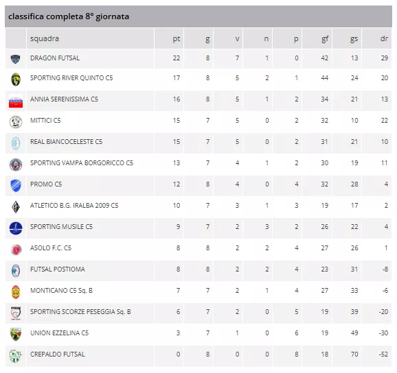 Nell’ anticipo di campionato il MITTICI di Mister Tela Lindim presso il Palazzetto dello sport di Miane (TV) subisce la seconda sconfitta in campionato e viene battuto 2 a 3 dallo SPORTING RIVER QUINTO di Mister Ronzani Enrico scivolando così al quarto posto in classifica a 7 punti dalla capolista. Gli ospiti conquistano il sesto risultato utile consecutivo e si portano al secondo posto in classifica a 5 punti dalla capolista. In queste prime giornate lo SPORTING RIVER QUINTO è l’unica squadra ad aver preso punti con il DRAGON FUTSAL e ora si propone come prima rivale in campionato.