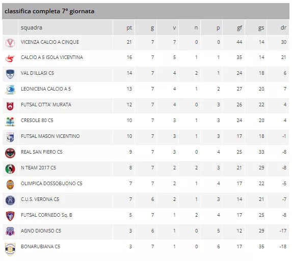 La 7ª giornata del campionato SERIE D Gir. A di Vicenza regala emozioni, conferme e qualche scossone in classifica. Il VICENZA CALCIO A CINQUE continua la sua marcia trionfale, con il CALCIO A 5 ISOLA VICENTINA che cerca di mantenere l'andatura della capolista, mentre dietro è battaglia serrata per la zona playoff, con il LEONICENA CALCIO A 5 e il FUTSAL CITTA' MURATA all'inseguimento del VAL D'ILLASI CS che scivola.