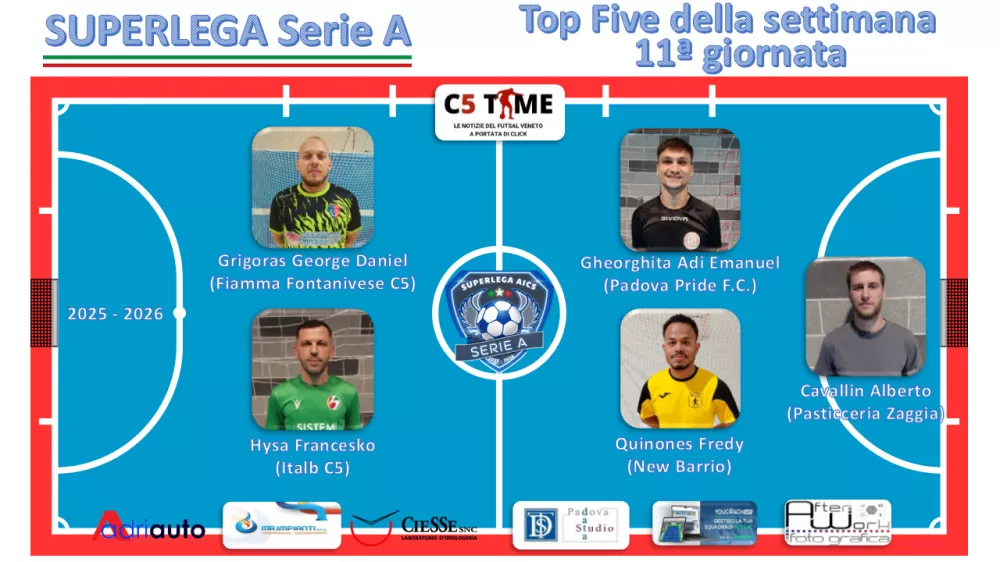 Martedì 16, al Vertigo Sport Center, gara vibrante tra GALAXY PD e SQUADRA DEL CUORE, risolta sul filo di lana per 3 a 4 a favore degli ospiti grazie alla doppietta del Top Five della settimana Bambara Antonio e ai gol di Dobriyev Kristian e Gennaro Leonardo. Per i GALAXY PD, doppietta d'orgoglio di Grossi Matteo e rete di Ballotta Samuele.
