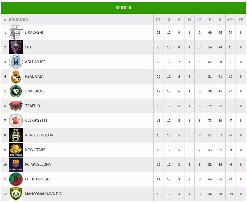 I RAGASHI guidano con un vantaggio di +3 sulla seconda. In coda, il punto guadagnato nel pareggio odierno permette al MANCOMANNAVA F.C. di salire a 10 punti e al FC BOTAFOGO di portarsi a 11, mantenendo apertissima la lotta per non retrocedere.