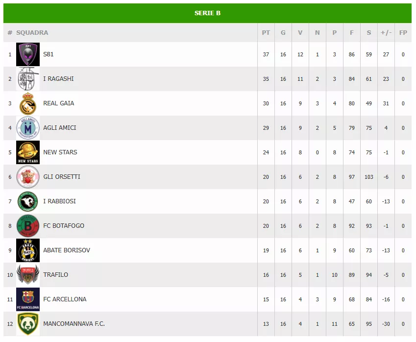 ZONA ROSSA: Situazione critica per il MANCOMANNAVA F.C., che con 11 sconfitte e una differenza reti di -30 vede la salvezza allontanarsi, tallonati dai RABBIOSI che faticano a trovare la via del gol (solo 47 reti fatte, peggior attacco del torneo).