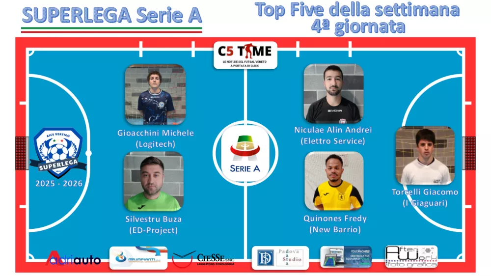 Lunedì 27 al Vertigo Sport Center di Padova, l'ED - PROJECT (3°) riprende la sua corsa con una vittoria convincente e senza appelli. La squadra si impone per 6 a 1 sul fanalino di coda, BIBITE BERTOCCO SANGREAL (12°). Il risultato è stato ipotecato dalla doppietta del Top Five della settimana Silvestru Buza, seguita dalle reti di Bulancea Eugen, Dimitriu Vasile, Stavciuc Eduard e Timofti Dinu. L'unica marcatura della Bibite Bertocco è di Oliveira Thiago. I tre punti confermano Ed - Project al 3° posto con 9 punti.