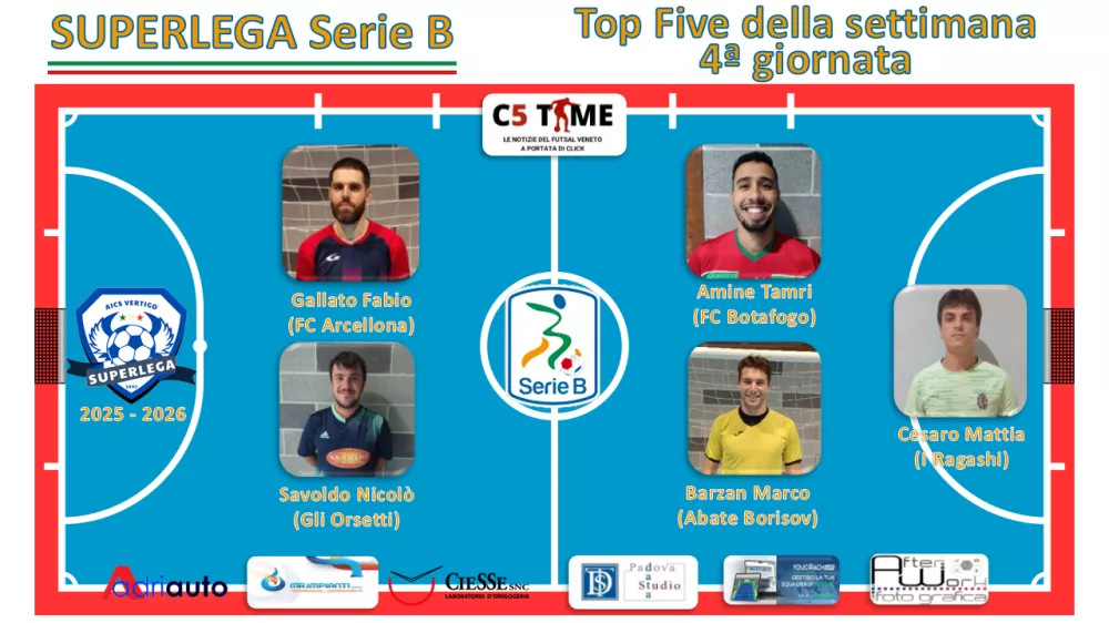 Giovedì 30 al Vertigo Sport Center di Padova, la sorpresa della giornata arriva nel posticipo: l'FC ARCELLONA (9°) ottiene la sua prima vittoria stagionale sconfiggendo a sorpresa il REAL GAIA (4°) per 4 a 3. I gol di Cardenas Rodriguez Mauricio, Fernandez Martinez Jose', il Capitano Top Five della settimana Gallato Fabio e Radu Andrei George valgono tre punti fondamentali per lasciare la zona bassa. Il Real Gaia, nonostante la doppietta di Ciatto Riccardo e il gol di Raffaelli Giacomo, incassa una sconfitta inattesa, restando fermo a 9 punti, ma perdendo contatto con il secondo posto.