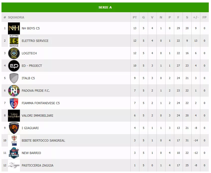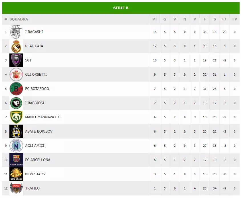 La classifica dopo 5 giornate vede i RAGASHI (15 punti) che mantengono saldamente la testa, inseguiti dal REAL GAIA (12 punti). L'S81 (10 punti) scende al terzo posto, ma le distanze sono minime in una classifica molto corta. L'FC BOTAFOGO (7 punti) guadagna terreno prezioso. In coda, il TRAFILO (1 punto) ha mosso per la prima volta la classifica, ma l'ultima posizione resta a rischio, seguito a breve distanza dai NEW STARS (3 punti).