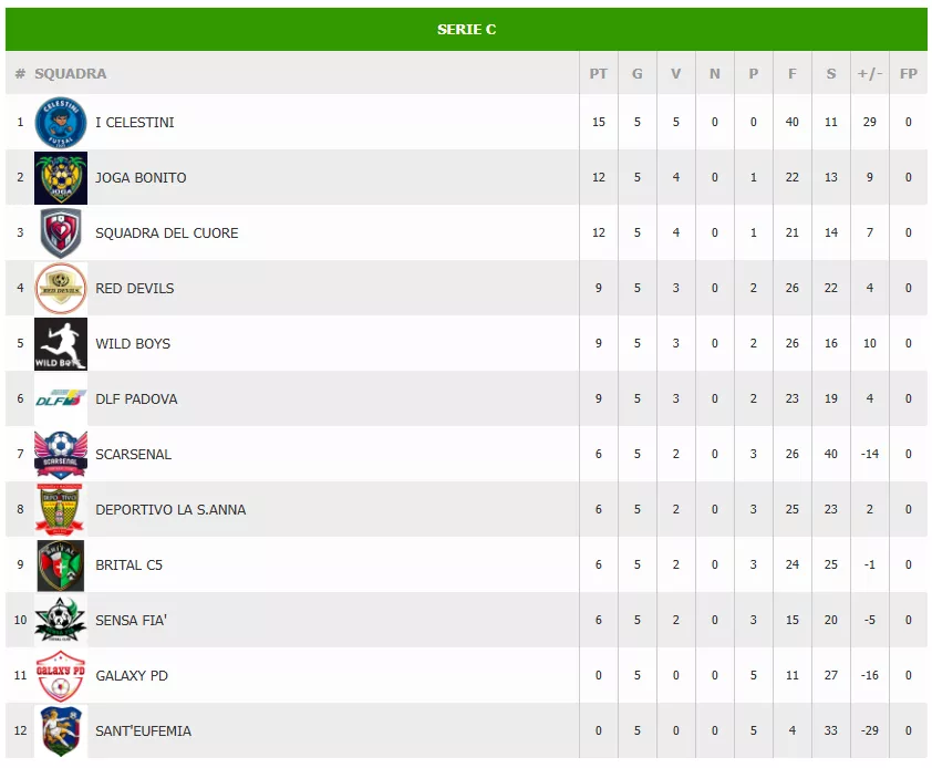 La classifica dopo 5 giornate: I CELESTINI (15 punti) mantengono un vantaggio di 3 punti, seguiti da JOGA BONITO e SQUADRA DEL CUORE (entrambe a 12 punti). RED DEVILS, WILD BOYS e DLF PADOVA (9 punti) lottano per i posti playoff. In coda, GALAXY PD e SANT'EUFEMIA (0 punti) sono ancora alla ricerca dei primi punti.