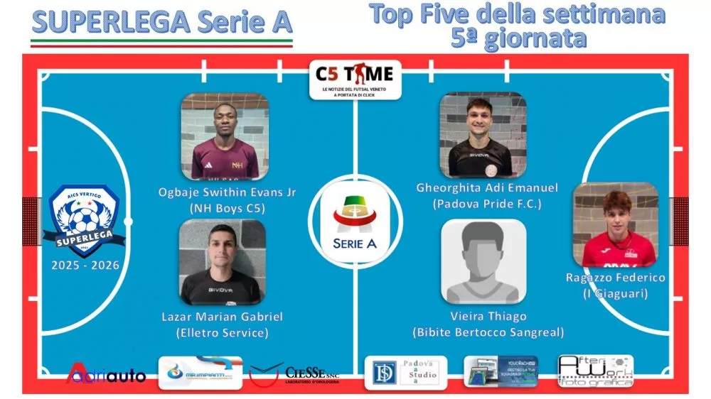 Lunedì 3 al Vertigo Sport Center di Padova, il big match tra la capolista NH Boys C5 con il miglior attacco del campionato (29 gol fatti) e la quarta in classifica ED - PROJECT è terminato con una pirotecnica divisione della posta, un 5 a 5 che non ammette repliche sulla spettacolarità. I NH Boys C5, pur mantenendo la vetta, hanno dovuto sudare le proverbiali sette camicie. Sugli scudi il bomber dell'NH Boys, Ion Gunea, autore di una tripletta fondamentale, affiancato dal Top Five della settimana Ogbaje Swithin Evans Jr con una doppietta. L'ED - Project ha risposto con veemenza, trovando in Timofti Dinu un incredibile mattatore con tre reti, supportato da Rusescu Mihail e Silvestru Buza. Un punto che fa morale per entrambi, ma l'NH Boys perde l'opportunità di allungare.