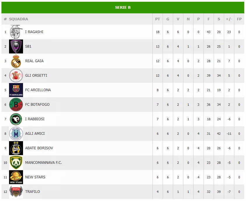 Colpo d'occhio: Una Serie B sempre più spettacolare. I RAGASHI sono ormai in fuga, ma dietro si infiamma la lotta per i posti d'onore con GLI ORSETTI che superano il REAL GAIA. Il TRAFILO, con il primo successo, lascia l'ultima posizione che ora non è più così isolata.