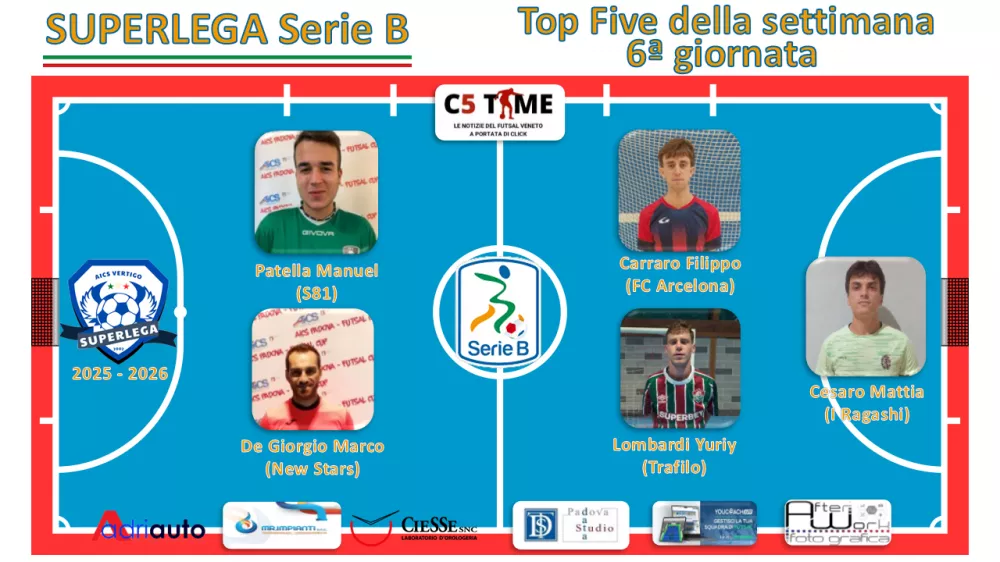 Alle spalle della capolista, il colpo grosso della giornata è della ITALB C5 (4°), che piega LOGITECH (5°) con un convincente 4 a 7 al Vertigo Sport Center di Padova mercoledì 12. La ITALB C5 vola in zona podio grazie a una prestazione mostruosa, guidata dalla tripletta del Top Five della settimana Hysa Francesko e il doppio di Ferreira Da Silva Gleydson Hudson, completato dalle reti di Mersini Mateo e Pelivani Roland. La sconfitta tiene ferma LOGITECH, a cui non bastano i gol di Abbiendi Matteo, Bessega Thomas, Campagnoli Dario e Coletto Simone.