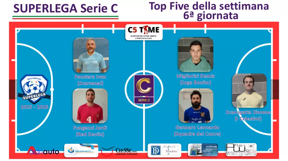 La capolista I CELESTINI (1°) forte del miglior attacco (46 reti all'attivo) e la miglior difesa della serie C con sole 13 reti subite non conosce ostacoli e mantiene la vetta a punteggio pieno, sconfiggendo BRITAL C5 (9°) per 2 a 6 martedì 11 sul sintetico del Vertigo Sport Center di Padova. Il successo è arrivato grazie a una prova magistrale di Repaci Stefano, autore di un poker, supportato dalle reti di Novaro Amerigo, Rigodanzo Nicolò e al supporto superlativo tra i pali del Top Five della settimana Scanagatta Simone. Per il BRITAL C5 i gol di De Podolinsky Rilke e Dona Vilson rendono meno amaro il passivo.