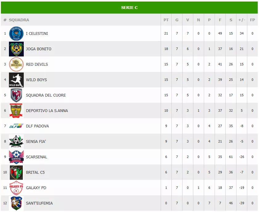 Non è stata una passeggiata, ma la vetta resta saldamente nelle mani de I CELESTINI! Martedì 18, al Vertigo Sport Center di Padova sul sintetico, la capolista ha dovuto sudare le proverbiali sette camicie per avere la meglio su una combattiva SQUADRA DEL CUORE. Il risultato finale, 3 a 2, premia il cinismo de I CELESTINI grazie alle reti decisive del Top Five della settimana Campanaro Andolfatto Giovanni, Novaro Amerigo e Rigodanzo Nicolò. Per la SQUADRA DEL CUORE, la doppietta di Cecconi Mattia (2) non è bastata a strappare punti. I CELESTINI restano a punteggio pieno (21 punti) con in dote il miglior attacco (49 reti all'attivo) e la miglior difesa della serie C con sole 15 reti subite.