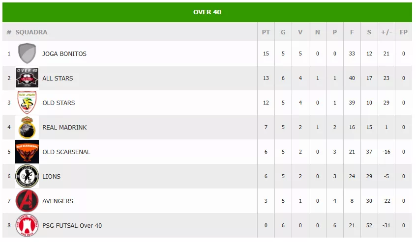 3. OLD STARS (12 PT): Nonostante la sconfitta, vantano la miglior tenuta difensiva. Sono la squadra con meno reti subite, avendo incassato solo 10 gol in 5 partite.