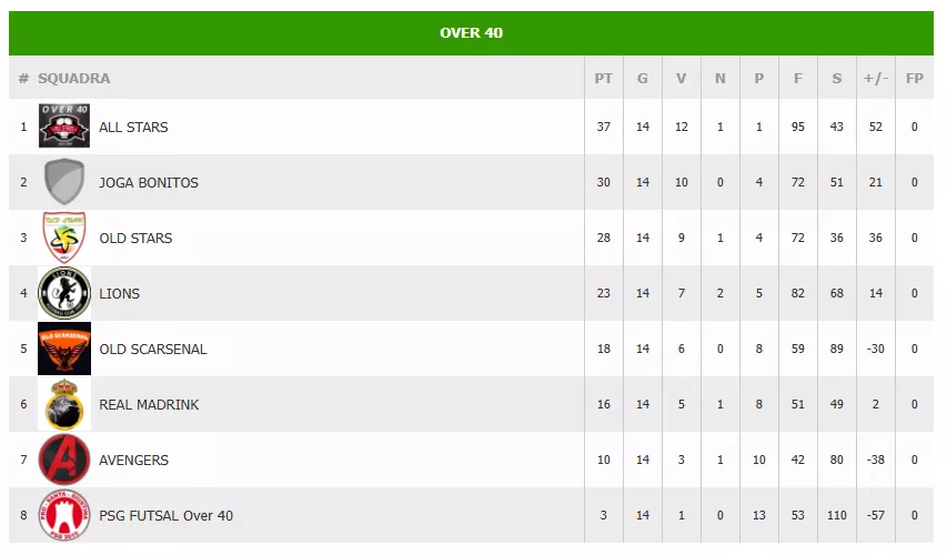 PSG FUTSAL OVER 40 - ALL STARS = 4 a 8 Giovedì 23/04/26 - 21:00 - Olof Palme