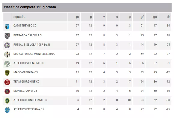 Al termine di questa 12ª giornata, i dati statistici evidenziano un equilibrio estremo al vertice del girone Eccellenza. La CAME TREVISO C5, il PETRARCA CALCIO A 5 e il FUTSAL BISSUOLA 1987 Sq. B guidano la classifica con 27 punti ciascuno.