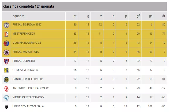 Al termine di questa 12ª giornata, i numeri celebrano il dominio del FUTSAL BISSUOLA 1987, che si conferma la squadra con più reti segnate (92) e contemporaneamente quella con meno reti subite (6) dell'intero girone. La solidità difensiva della squadra di Mister Visentini Diego è il vero fattore che sta decidendo la stagione, con una media di soli 0,5 gol subiti a partita.