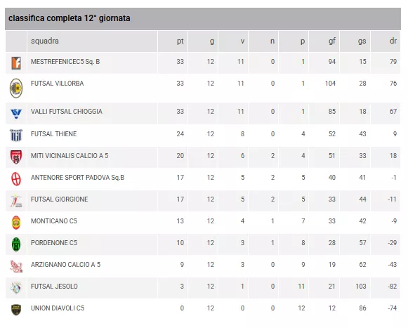 Squadra con meno reti subite: MESTREFENICEC5 Sq. B, capace di incassare solo 15 gol in 12 gare.