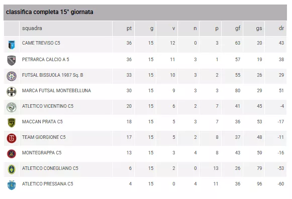 Con la regular season che si avvia alla conclusione (mancano solo tre turni), la classifica del Girone Eccellenza vede la CAME TREVISO C5 e il PETRARCA CALCIO A 5 saldamente in vetta con 36 punti, seguiti dal FUTSAL BISSUOLA 1987 Sq. B a quota 33 e dalla MARCA FUTSAL MONTEBELLUNA a quota 30 punti.