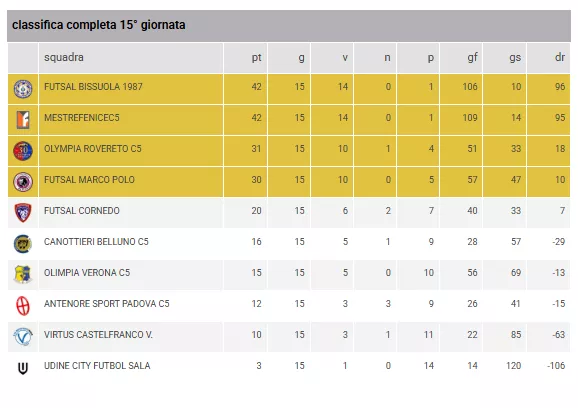 A tre giornate dalla conclusione della regular season, la lotta per il vertice è ormai un discorso solo per le due mestrine: FUTSAL BISSUOLA 1987 e MESTREFENICEC5 saldamente al comando con 42 punti, il FUTSAL BISSUOLA 1987 è in vantaggio negli scontri diretti: vinto 1 a 6 e perso 0 a 3. Un'altra battaglia è anche per gli altri due posti che garantiscono l'accesso alle Finali Regionali: il OLYMPIA ROVERETO C5 (31 punti) e il FUTSAL MARCO POLO (30 punti) hanno messo una definitiva ipoteca sulla qualificazione, in gioco la terza posizione da qui al 12 aprile, il OLYMPIA ROVERETO C5 è in vantaggio negli scontri diretti: vinto 5 a 1 e perso 5 a 3.