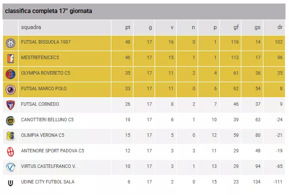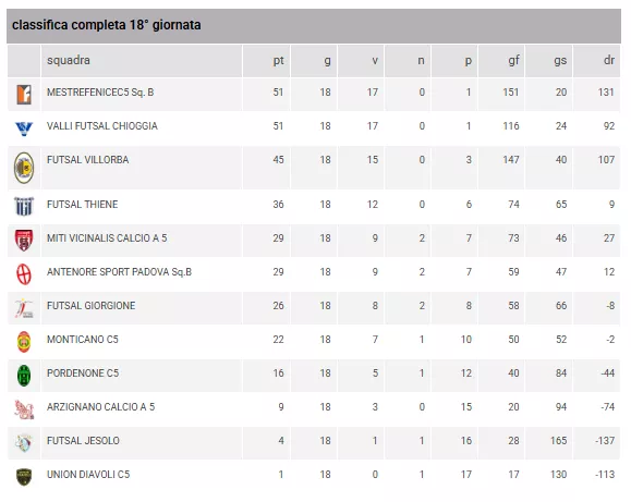 La classifica parla chiaro e celebra il dominio veneziano. Il FUTSAL BISSUOLA 1987 si conferma la "macchina da guerra" del girone: è la squadra con il maggior numero di reti segnate (116) e contemporaneamente quella con la miglior difesa (solo 14 reti subite), un record che giustifica i 48 punti in classifica.
