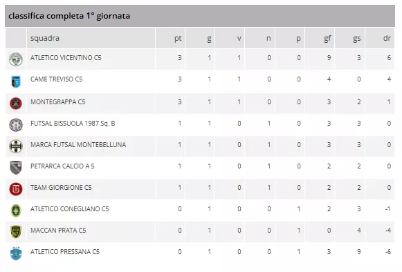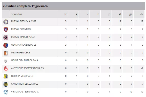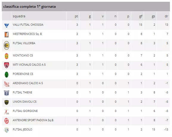 ANTENORE SPORT PADOVA SQ.B - MESTREFENICEC5 SQ. B = 1 a 8 (1 a 4)La copertina della prima giornata spetta di diritto al VALLI FUTSAL CHIOGGIA, autore di un'impresa che lo proietta subito al vertice della classifica con un'impressionante differenza reti: