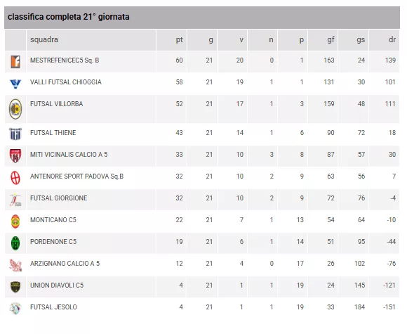 A una sola giornata dal termine, la classifica parla chiaro. La MESTREFENICEC5 Sq. B domina dall'alto dei suoi 60 punti, forte della miglior difesa del torneo (24 reti subite). Il titolo di miglior attacco spetta però di diritto alla capolista stessa con l'incredibile cifra di 163 reti segnate, tallonata da vicino dal FUTSAL VILLORBA (159). Se il vertice sembra blindato ma, domenica prossima alle 15.30 infatti ci sarà lo scontro diretto contro: VALLI FUTSAL CHIOGGIA vs MESTREFENICEC5 Sq. B, praticamente una finale con in palio il titolo di Campioni del girone Promozione. La lotta per il quarto posto resta accesa, mentre nelle retrovie Jesolo e Union Diavoli proveranno a chiudere l'anno con un sorriso nell'ultimo turno. Il livello tecnico mostrato in questa penultima giornata conferma la crescita esponenziale del movimento giovanile veneto.