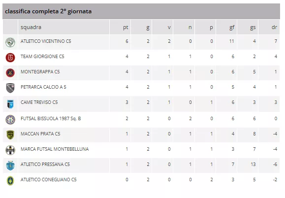 L'ATLETICO VICENTINO C5 si prende la testa della classifica a punteggio pieno con 6 punti, grazie a due vittorie su due. La squadra vicentina è la migliore del girone, vantando il primato di miglior attacco con 11 reti segnate e la miglior differenza reti (+7).