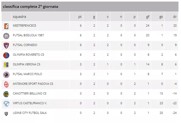 Al vertice, con 6 punti in 2 gare, troviamo un terzetto che ha dimostrato una superiorità impressionante: MESTREFENICEC5, FUTSAL BISSUOLA 1987 e FUTSAL CORNEDO.