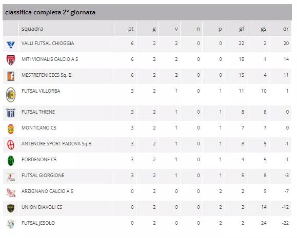 Al vertice della classifica si forma un trio a punteggio pieno con 6 punti: VALLI FUTSAL CHIOGGIA, MITI VICINALIS CALCIO A 5 e MESTREFENICEC5 SQ. B.