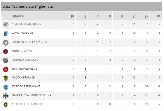 Con i pareggi e le vittorie, la classifica si è fatta ancora più corta in cima, ma a prendersi il comando in solitaria è l'ATLETICO VICENTINO C5 con 7 punti, unica squadra ancora imbattuta.