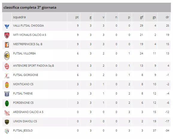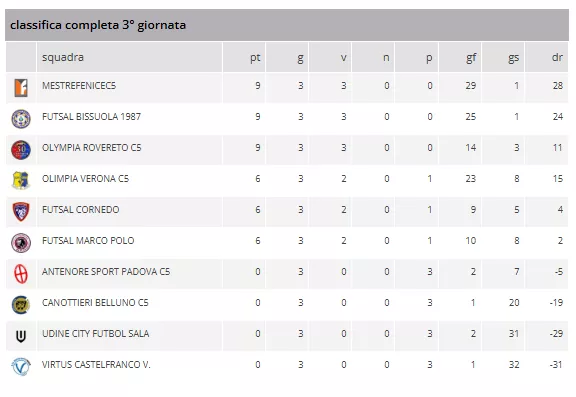 In vetta, il MESTREFENICEC5, il FUTSAL BISSUOLA 1987 e l'OLYMPIA ROVERETO C5 mantengono un passo perfetto, totalizzando 9 punti in 3 partite.