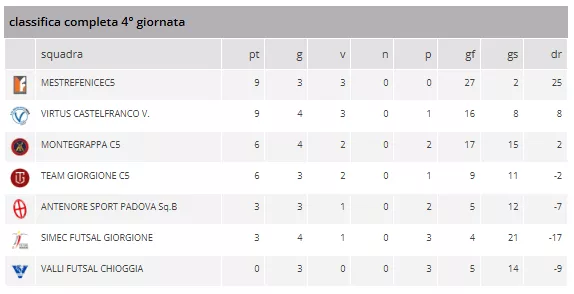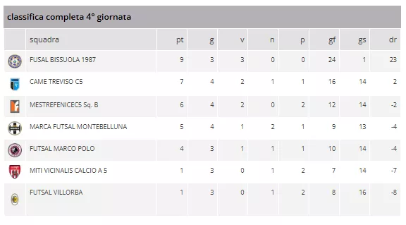 La quarta giornata del campionato Under 15 Girone 5, ha riservato risultati eclatanti che hanno consolidato il primato del FUTSAL BISSUOLA 1987 e rinvigorito la corsa del CAME TREVISO C5. La sorpresa negativa è stata la sonora sconfitta del MESTREFENICEC5 SQ. B, mentre il FUTSAL MARCO POLO ha saputo approfittare al meglio del turno.