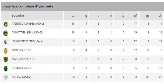 La quarta giornata del campionato Under 15 Girone 4, ha ribadito il dominio delle formazioni di testa, l'ATLETICO CONEGLIANO C5 e il CANOTTIERI BELLUNO C5, entrambe vittoriose e ora appaiate in vetta con 10 punti. Il MONTICANO C5 ha consolidato la terza piazza, mentre la zona calda della classifica si è fatta sempre più pesante per le squadre in fondo alla graduatoria.
