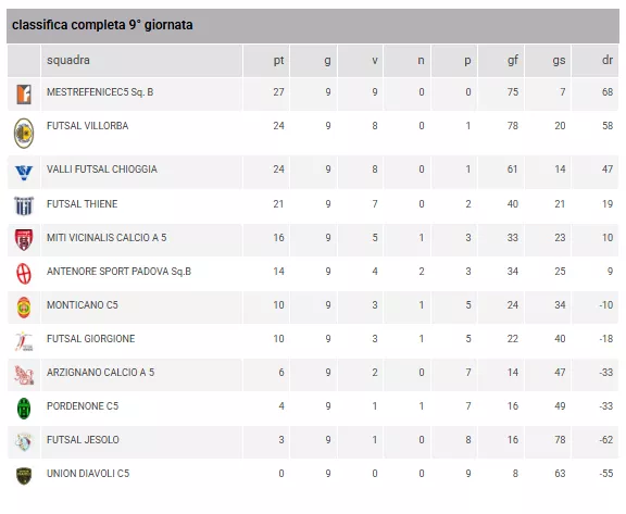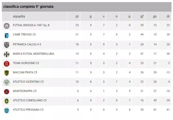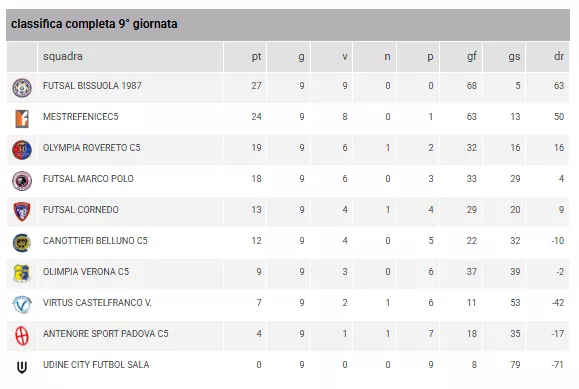 La classifica attuale vede il FUTSAL BISSUOLA 1987 solitario al comando con 27 punti e un percorso netto di 9 vittorie su 9.