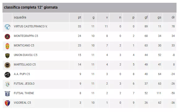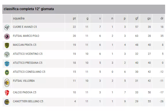 La classifica a sei turni dal termine della stagione regolare delinea scenari avvincenti. Il Futsal Cornedo (30 pt) sembra irraggiungibile al primo posto, blindando la qualificazione come testa di serie. La sconfitta del Futsal Bissuola (24 pt) riapre la corsa alla seconda piazza, con il MestreveneziaC5 (23 pt) ora distante un solo punto. L'ultimo posto disponibile per le Finali Regionali è attualmente occupato dalla Came Treviso C5 (19 pt), che però sente il fiato sul collo dell'Antenore Sport Padova (18 pt).