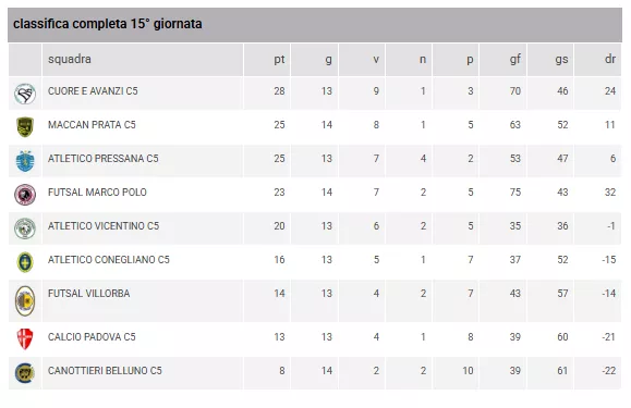 A quattro giornate dal termine della regular season, la classifica vede il CUORE E AVANZI C5 mantenere il comando con 28 punti, insidiato dal duo MACCAN PRATA C5 e ATLETICO PRESSANA C5 a quota 25. Poco più distante, il FUTSAL MARCO POLO (23 pt.) si conferma la macchina da gol del girone.