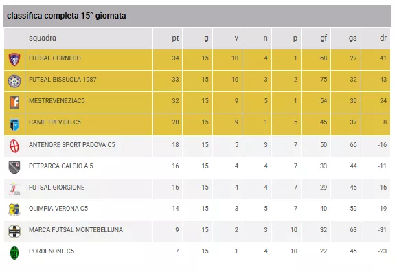 A tre turni dalla fine della regular season, la situazione nel Girone Élite è più incandescente che mai. Il FUTSAL CORNEDO mantiene la vetta con 34 punti, ma il FUTSAL BISSUOLA 1987 incalza a una sola lunghezza di distacco (33 pt.). Il MESTREVENEZIAC5 (32 pt.) e la CAME TREVISO C5 (28 pt.) completano attualmente il quartetto che avrebbe accesso alle Finali Regionali per il Titolo Veneto.
