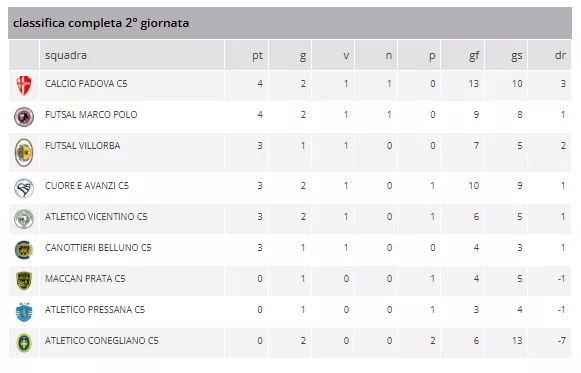 In fondo alla classifica, a quota zero, troviamo MACCAN PRATA C5 (con 1 gara), ATLETICO PRESSANA C5 (con 1 gara) e ATLETICO CONEGLIANO C5 (con 2 gare). In particolare, l'ATLETICO CONEGLIANO C5, nonostante abbia segnato 6 gol in questa giornata, sconta una differenza reti negativa (-7) a causa dei 13 gol subiti.