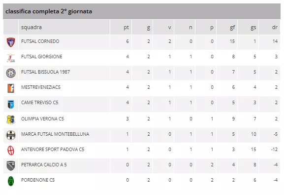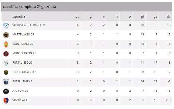 In testa alla classifica, in solitaria e a punteggio pieno, troneggia il FUTSAL CORNEDO con 6 punti in 2 gare. La squadra detiene il primato provvisorio di miglior attacco con 15 reti segnate e miglior difesa con solo 1 rete subita.