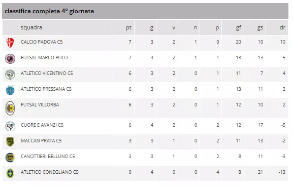 La classifica si presenta cortissima, con le prime sei squadre racchiuse in un solo punto. In testa, a pari merito con 7 punti, troviamo il CALCIO PADOVA C5 e il FUTSAL MARCO POLO.